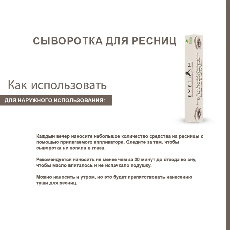 Каждый вечер наносите небольшое количество средства на ресницы с помощью прилагаемого аппликатора. Следите за тем, чтобы сыворотка не попала в глаза. Рекомендуется наносить не менее чем за 20 минут до отхода ко сну, чтобы масло впиталось и не испачкало подушку. Можно наносить и утром, но это будет препятствовать нанесению туши для ресниц.
