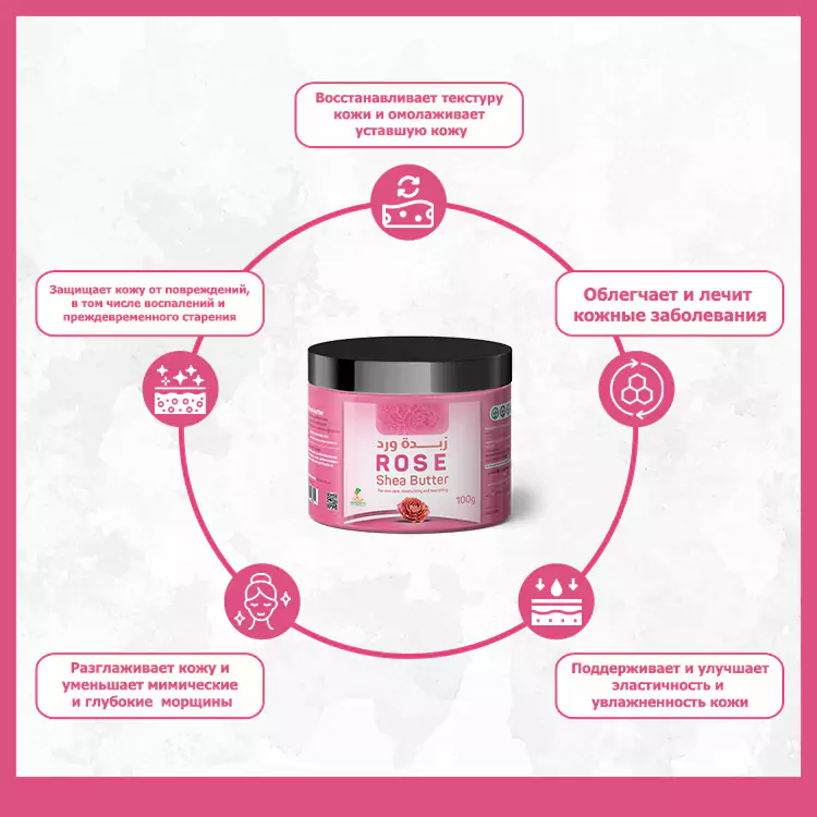Антисептическое действие масла ши и розового масла помогает при незначительных ранах и кожных инфекциях. Сухая кожа смягчается после втирания этой смеси и избавляется от зуда. Это масло образует защитную пленку на коже, и препятствует проникновению бактерий.