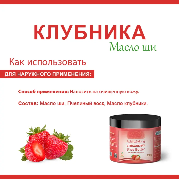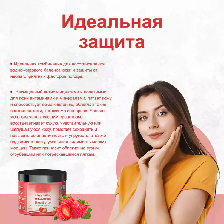Масло ши с клубничным маслом разработано для ежедневного ухода. Его питательные и очищающие свойства являются лучшим ежедневным средством по уходу за телом и защищают кожу после душа.