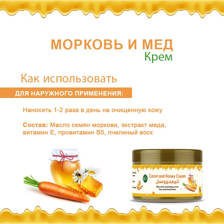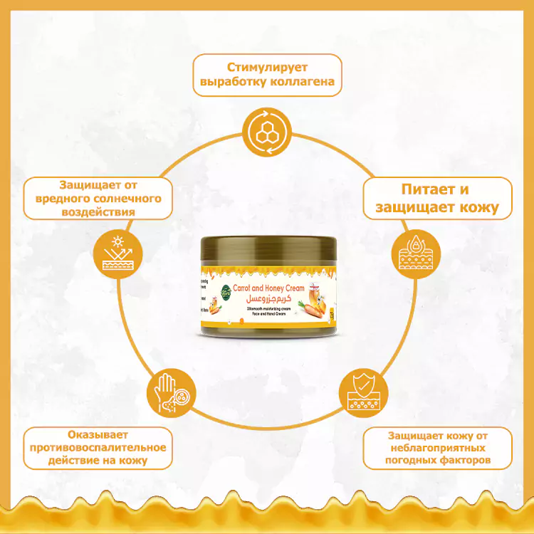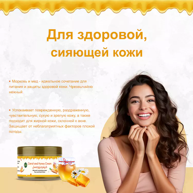 Морковь и мед - суперпродукты - питают и защищают кожу от пятен, угревой сыпи, старения, пигментации и сухости.  Их сочетание балансирует состояние кожи и омолаживает, обеспечивая коже здоровое сияние.