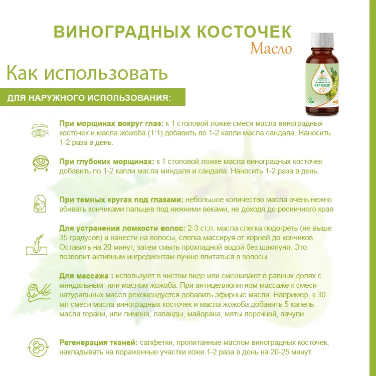 Регенерация тканей — салфетки, пропитанные маслом виноградных косточек, накладывать на пораженные участки кожи 1-2 раза в день на 20-25 минут.