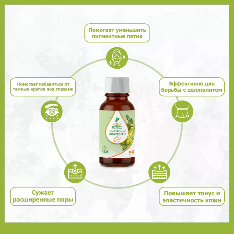 Масло виноградных косточек идеально подходит в качестве базового масла для ухода за кожей и различных видов массажа, прежде всего благодаря своей шелковистой, нежной и гладкой консистенции. Оно содержит большое количество антиоксидантов — важнейших питательных веществ и ферментов, которые помогают защитить кожу от повреждений и старения. Натуральное масло виноградных косточек содержит линолевую кислоту — ненасыщенную жирную кислоту, играющую ключевую роль в поддержании здоровых клеточных мембран. Масло виноградных косточек мягко впитывается в кожу, образуя увлажняющий слой, который способствует интенсивной регенерации и реструктуризации поврежденных и напряженных тканей кожи.
