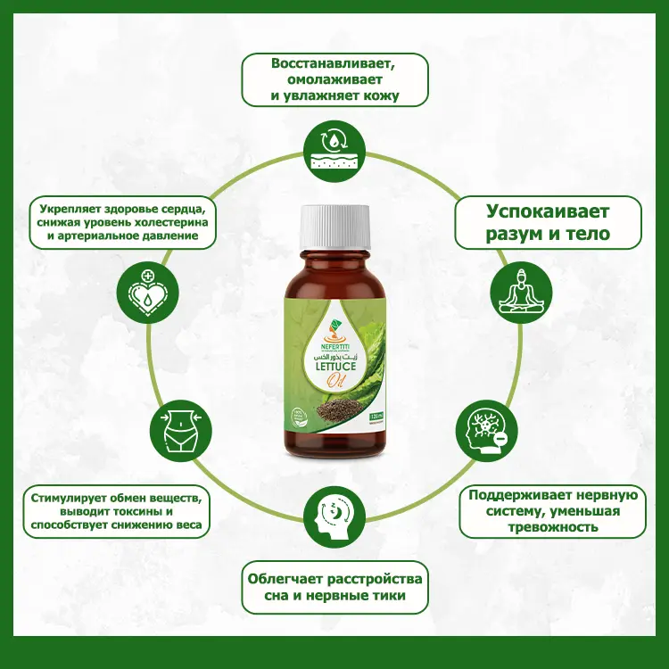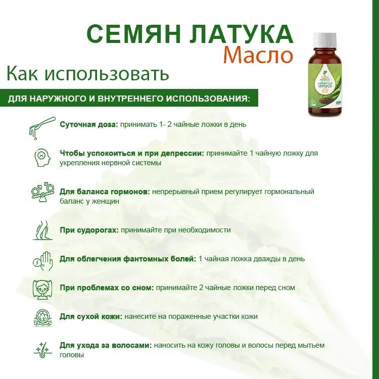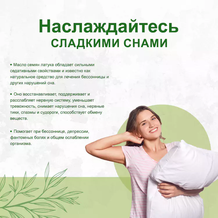Масло семян салата латук оказывает успокаивающее действие и уменьшает проблемы с засыпанием у пациентов, страдающих от бессонницы или постоянного состояния тревоги. Масло семян латука обладает успокаивающим и расслабляющим эффектом, помогает легче заснуть, способствует расслаблению после стресса и тяжелого дня.
