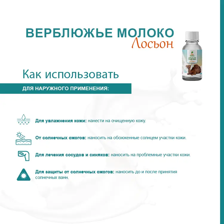 Кроме всего прочего, благодаря своей способности глубоко проникать в кожу и действовать на клеточном уровне, лосьон Верблюжье молоко помогает облегчить симптомы кожных заболеваний, таких как экзема и псориаз.