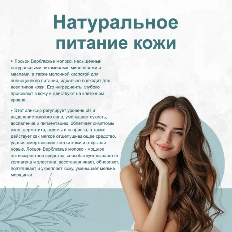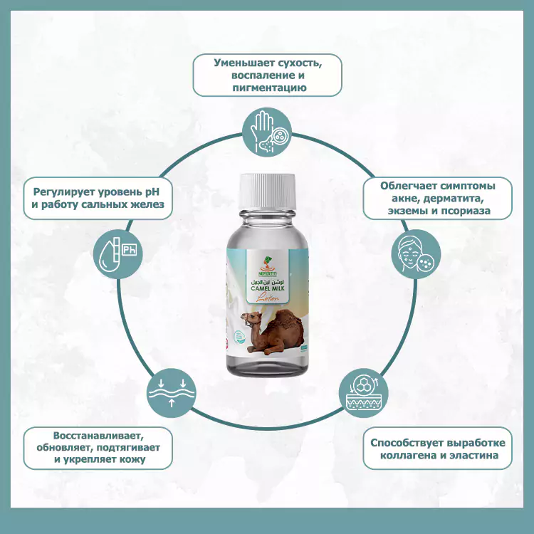 Являясь источником необходимых витаминов и минералов, этот лосьон является мощным омолаживающим средством. Его мощные антиоксидантные свойства помогают защитить от вредных факторов окружающей среды и предотвратить появление морщин, пигментных пятен и дряблости кожи. Лосьон Верблюжье молоко способствует выработке коллагена и эластина, восстанавливая и обновляя кожу, подтягивая и укрепляя ее, и соответственно, уменьшает появление морщин.