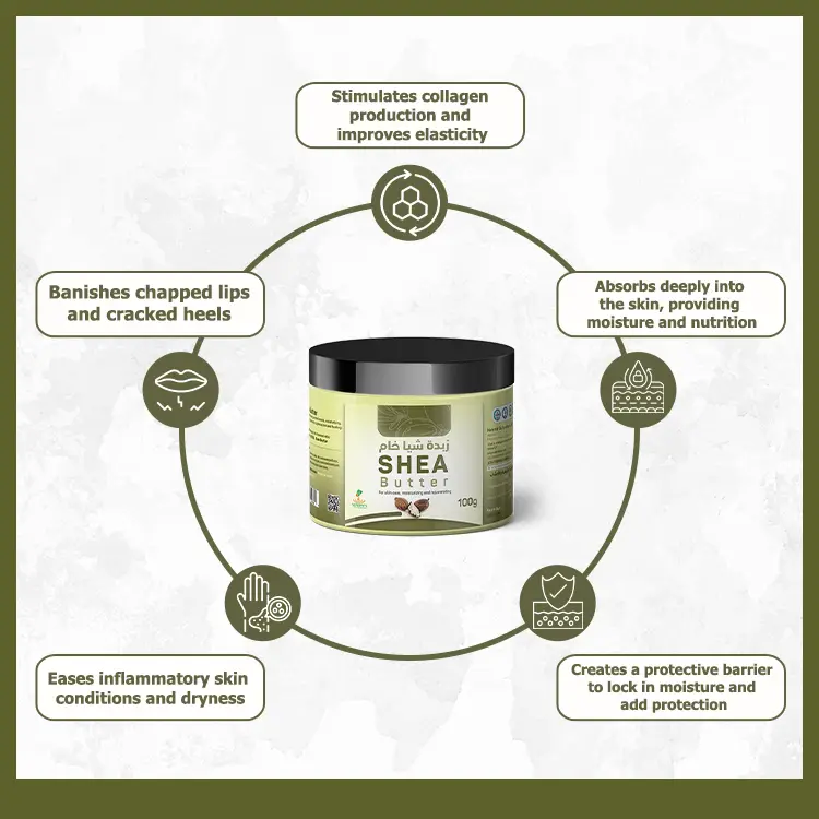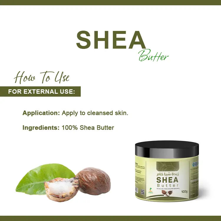 Suitable for all skin types.  Absorbs deeply into the skin to nourish and stimulate cellular activity. Repairs damaged and dry skin. Protects against wrinkles and stretchmarks. Relieves inflammatory joint diseases. Combats dry, brittle and lifeless hair, and repairs split ends. Botanical Name: Vitellaria paradoxa Family: Sapotaceae Parts used: cores Natural: Yes Purity: 100% pure ISO certified: ISO, COA & MSDS Ingredients: triterpenes, triterpene alcohols, stearic acid, allantoin Linolenic acid, vitamin E, palmetic acid, beta-carotene Country of Origin: Egypt Brand: Nefertiti for natural oils & herbs