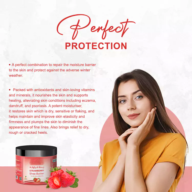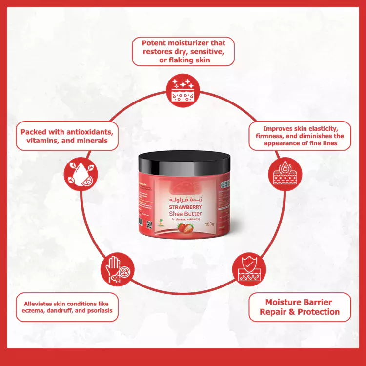 The protective function of Shea Butter with Strawberry Oil provides the skin with a natural barrier against environmental hazards and bacteria. Its moisturising properties make it an anti ageing product, as the skin loses moisture and elasticity more actively with age, and regular use of Shea Butter with Strawberry Oil will help to prevent this. Strawberry oil provides the skin with the necessary hydration. This mixture is effective for skin conditions such as acne, psoriasis, eczema and dermatitis, as well as skin damage from sunburn. By restoring skin elasticity, Shea Butter with Strawberry Oil helps with stretch marks and scars. To do this, place some Shea Butter with Strawberry Oil in the palm of your hand and then apply it to your skin.