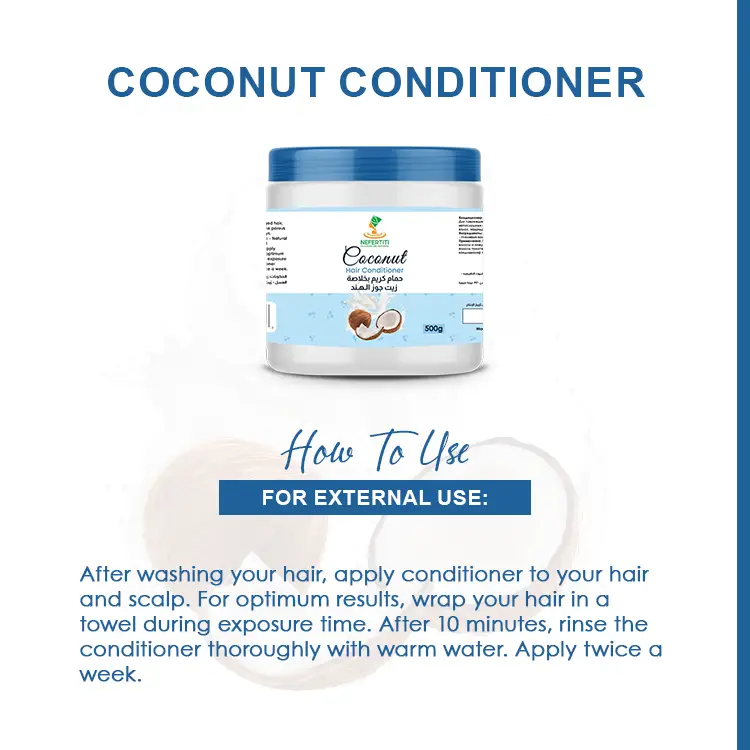 After shampooing, apply Nefertiti Coconut Oil Conditioner to hair and scalp. It is helpful to wrap the hair in a towel during exposure. Rinse off the conditioner thoroughly after 5-10 minutes. Recommended to apply 2 times a week.
