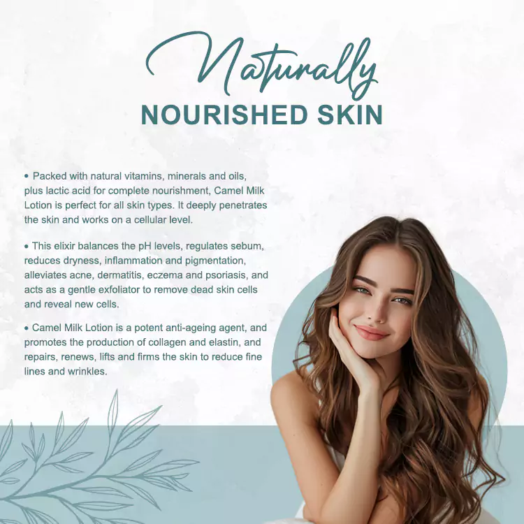 Being a powerhouse of essential vitamins and minerals, this lotion is a potent anti-ageing agent. Its powerful antioxidant properties help to protect against environmental factors and prevent wrinkles, age spots and sagging skin. Camel milk lotion promotes the production of collagen and elastin, repairing and renewing the skin to lift and firm, and subsequently reduce the appearance of fine lines and wrinkles.