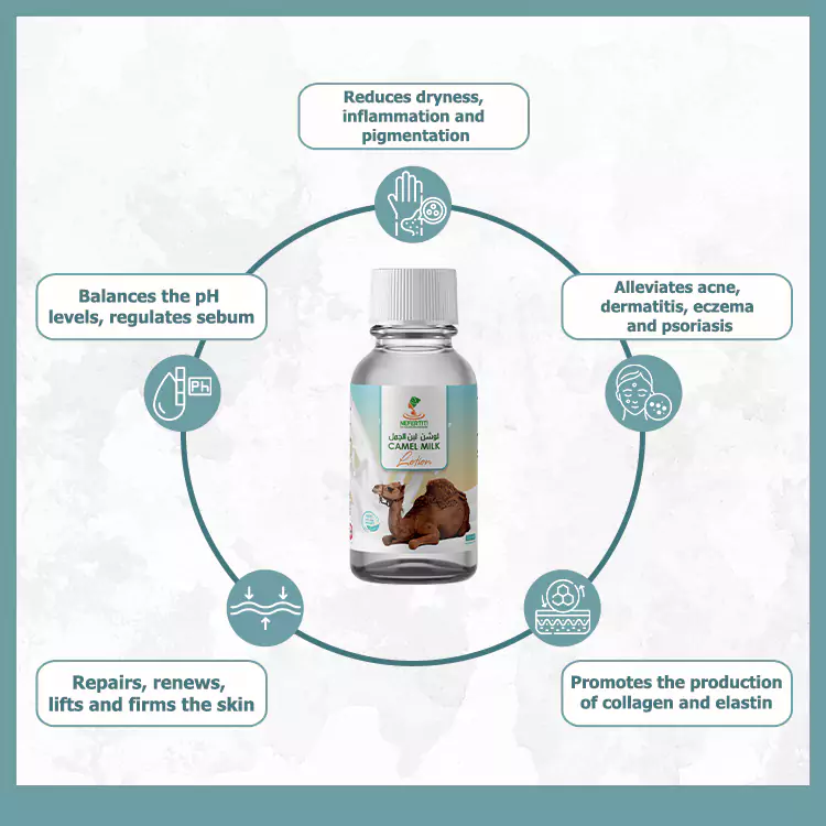 A natural remedy for acne, camel milk balances the pH level of the skin, and helps to regulate sebum production.The AHAs, including lactic acid, provide powerful natural exfoliation action, removing dead skin cells and unblocking pores. The antimicrobial properties kill any bacteria already present and its anti-inflammatory effect tames any redness and swelling. Furthermore, camel milk lotion can help to prevent scarring, and reduce the appearance of existing acne scars.