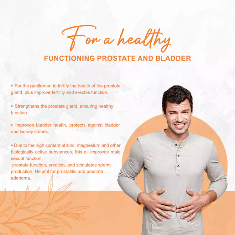 Pumpkin oil contains a unique complex of substances with diuretic, bactericidal, anti-inflammatory, antitumor and androgenic properties. It has a beneficial effect on the functioning of the prostate gland, improves erectile function and normalizes the process of spermatogenesis, and protects the tissues and blood vessels of the urogenital organs from the development of inflammatory processes. Therefore, pumpkin seed oil is widely used in the prevention and complex treatment of prostatitis, prostate adenoma, erectile dysfunction and diseases of the bladder and urethra.