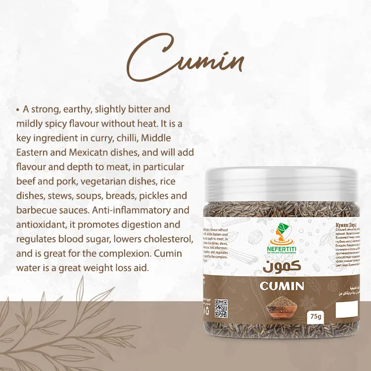 In the kitchen, cumin has a strong, earthy, slightly bitter and mildly spicy flavour without heat. It is a key ingredient in curry, chili, Middle Eastern and Mexican dishes, and will add flavour and depth to meat, in particular beef and pork, vegetarian dishes, rice dishes, stews, soups, breads, pickles and barbecue sauces.